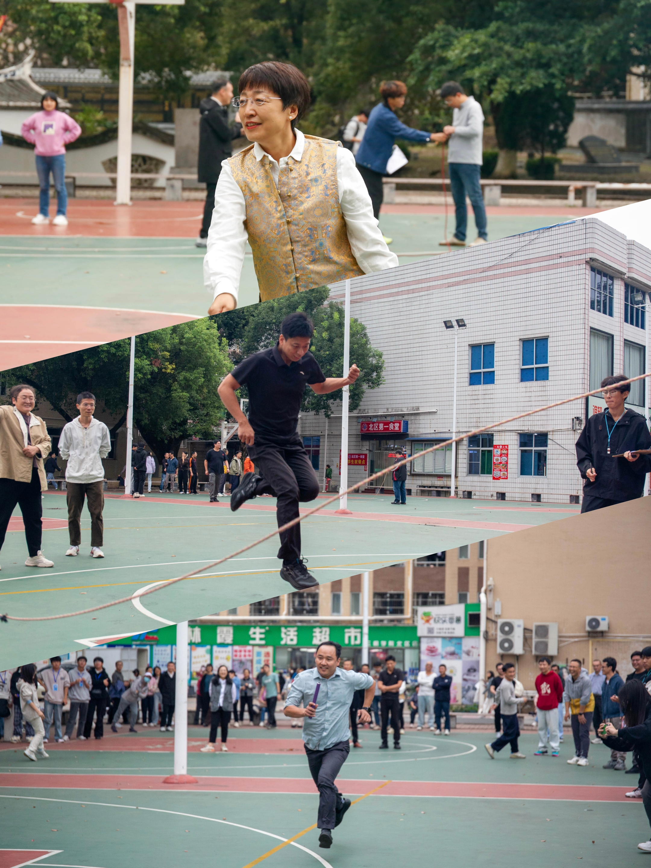 本次趣味运动会设置了八字跳绳、立定投篮、篮球半场往返跑三个项目,每个项目都充满了趣味性与挑战性,考验着团队的协作能力与个人的运动技巧。在八字跳绳项目中,队员们配合默契,每一次成功的跳跃都是团队协作的完美体现,现场计数声、加油声此起彼伏。在立定投篮项目中,老师们站在罚球线处一展投篮绝技。老师们或屏息凝神、或果断出手,篮球不时命中篮筐,赢得阵阵欢呼。篮球半场往返跑项目同样精彩,队员们你追我赶,在交接棒的瞬间传递着速度与激情,全力冲刺的身影成为球场上一道亮丽的风景线。