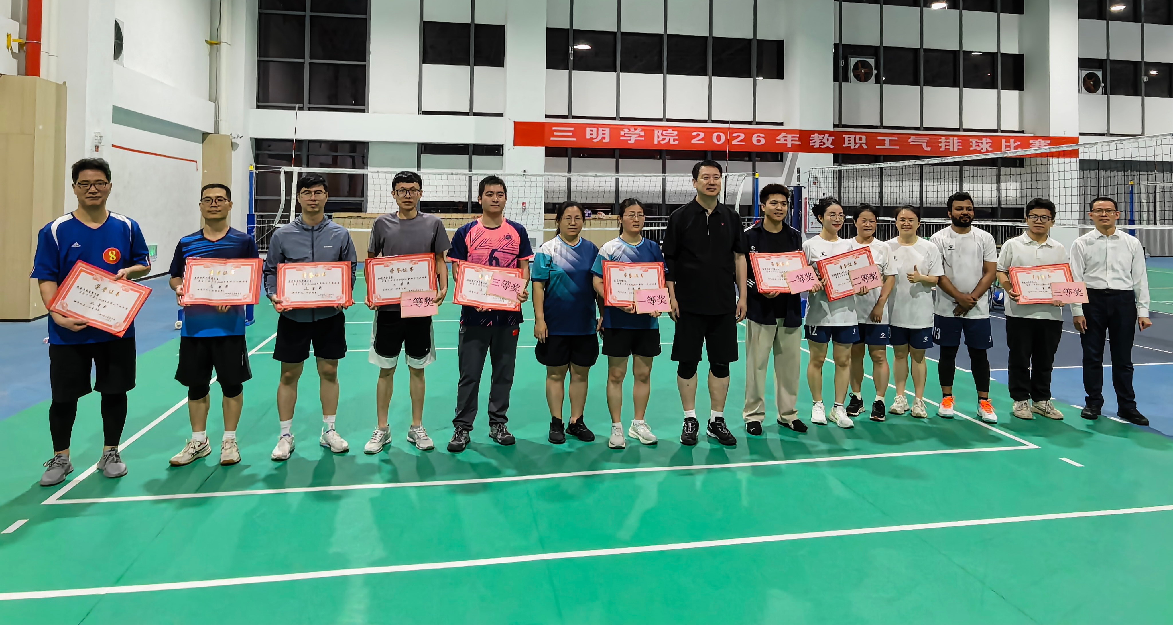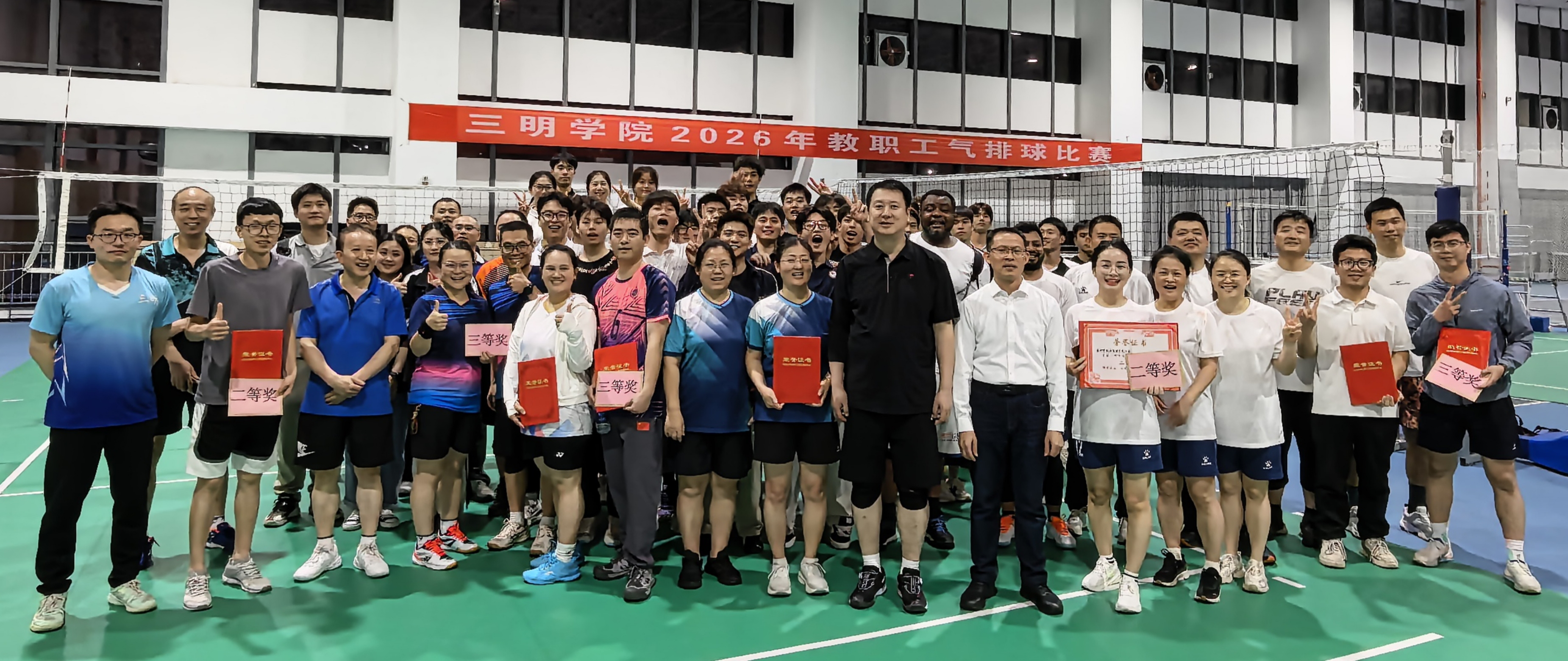 为持续丰富广大教职工的业余文化生活,进一步推动全民健身运动在校园内的深入开展,促进教职工身心健康发展,营造团结协作、奋勇争先、健康向上的校园文化氛围,4月20日至23日,由校工会主办、教工气排球协会承办的三明学院2026年教职工气排球赛在南区体育中心隆重举行。本次比赛得到了全校教职工的积极响应,共有14支二级工会代表队、150余名运动员报名参赛。